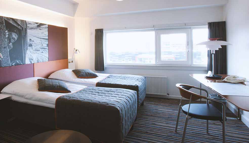 Umiaq rooms are the newest type of rooms in Hotel Arctic. They can be booked for either single or double occupancy. They feature a king-sized double bed or two single beds and are suitable for 2 adults. An extra cot is provided for a child under 3 years old free of charge. Umiaq rooms are not suitable for a 3rd adult bed.